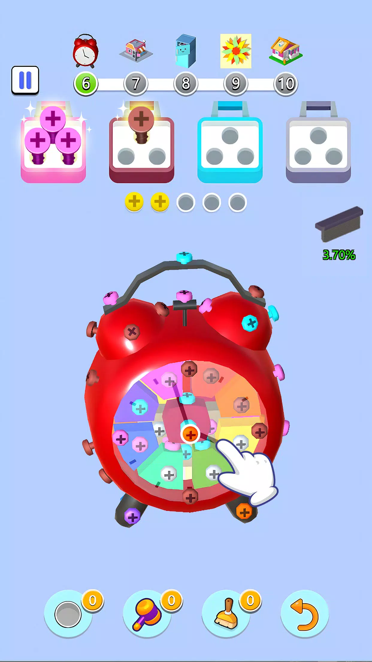 Your goal is to dismantle the 3D model by strategically removing all nuts and bolts. Tap the screws to unscrew them, carefully organizing them in the corresponding color toolboxes. Efficient color sorting is key to progressing through the levels.