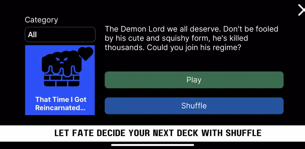 - Diversos mazos organizados en categorías populares de fandoms.