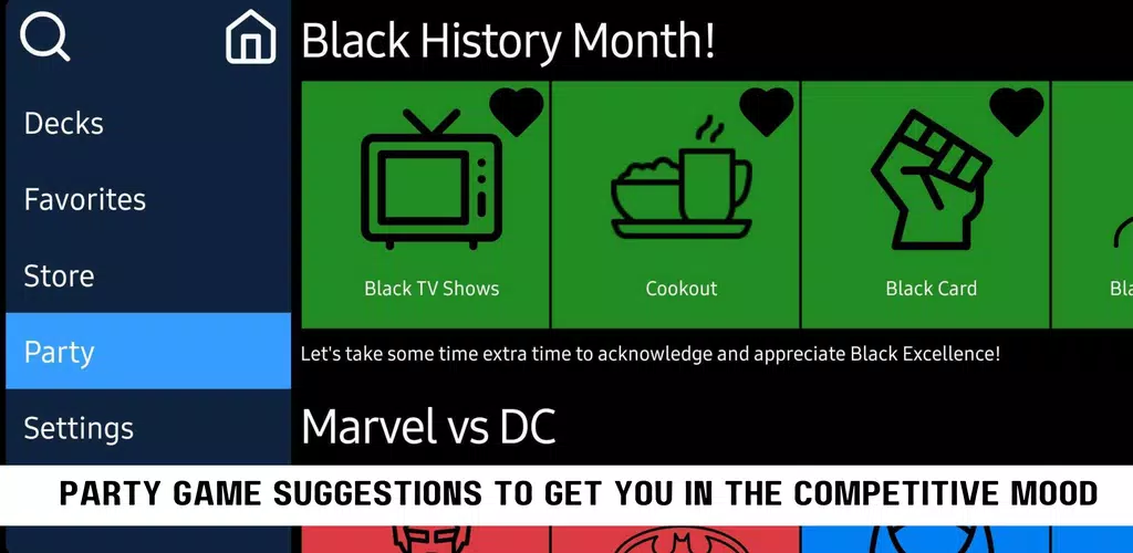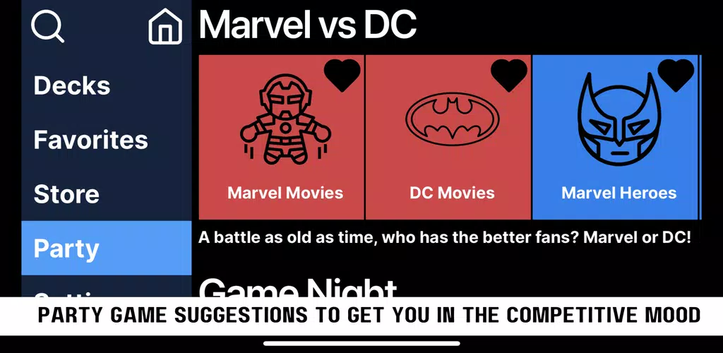 ¡Un juego diseñado para los verdaderos fans! Experimenta las charadas como nunca antes. Elige entre mazos temáticos de fandoms, sigue el tipo de juego y ¡que comience el entretenimiento! Gesticula, actúa, baila o canta camino a la victoria y reclama tus derechos de fanático supremo entre tus amigos.