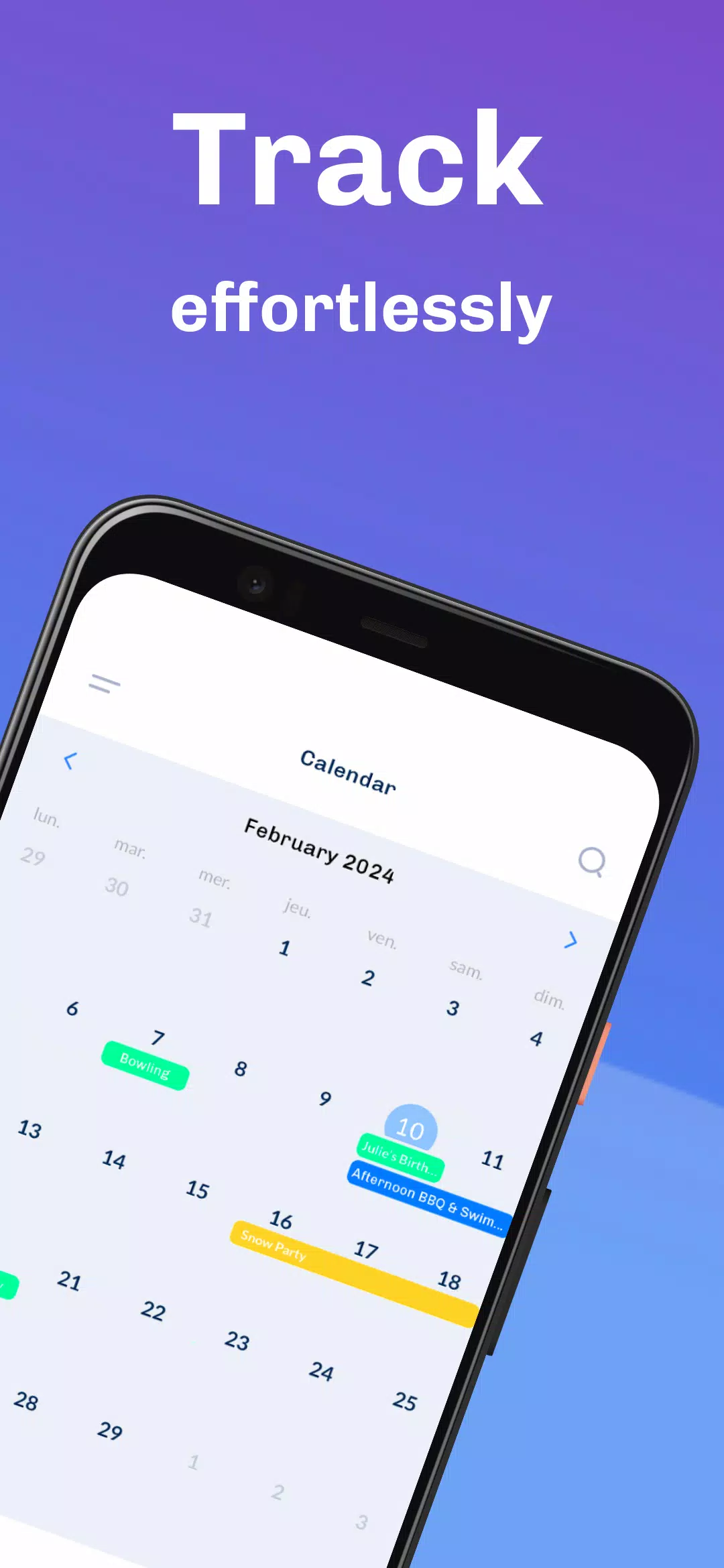 • Gérez tous vos événements via le calendrier intégré ! Les statuts de réponse (invité, intéressé, participant) sont codés par couleur pour une consultation rapide.