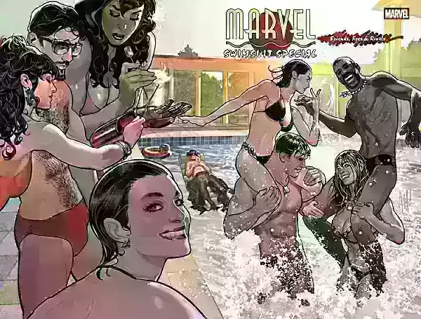 « Roxxon Comics est de retour, publiant son propre NUMÉRO SPÉCIAL MAILLOT DE BAIN NON AUTORISÉ », peut-on lire dans la description du Marvel Swimsuit Special. « La Guêpe prend les choses en main et transforme la situation en une opportunité pour les héros de Marvel de devenir les stars de leur propre shooting mode maillots de bain mondial ! Mais ne vous inquiétez pas, les Vrais Croyants — nous savons ce pour quoi vous êtes VRAIMENT ici ! Ce numéro spécial surdimensionné offre une page époustouflante après l'autre, le tout enveloppé dans une histoire pour que vous puissiez dire que vous êtes en train de "le lire pour les articles…" »