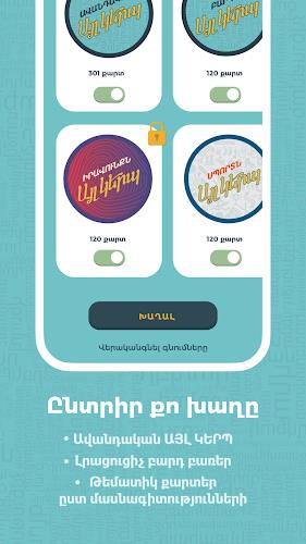 Сочетая доступность с развлечением, Ayl kerp / Այլ կերպ предлагает бесконечное веселье благодаря своим умным функциям — от разнообразия тем до голосового управления. Идеально подходит для семейных вечеров или корпоративных тимбилдингов. Скачивайте прямо сейчас, чтобы начать своё приключение в угадывании слов!