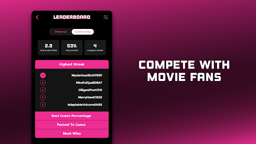 * 全球竞技:检验电影知识并与世界各地爱好者同台较量。应用支持玩家分数对比,营造扣人心弦的竞技氛围。
